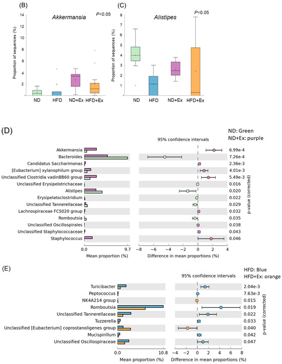 Fecal microbiota analysis: (A) taxonomic analysis; (B,C) comparison of 4 groups (list of bacteria species that showed significant differences among the four groups); (D) bacteria species that showed significant differences between the two groups of ND and ND + Ex; and (E) bacteria species that showed significant differences between the two groups of HFD and HFD + Ex.