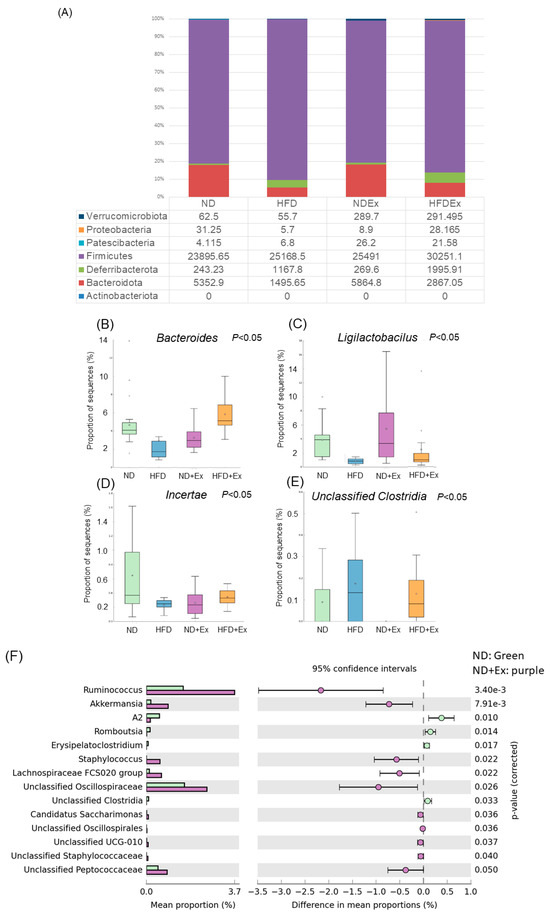 Bacteroides, Ligilactobacillus, and Clostridia were remarkably different among the four groups. In the case of ND (n = 6 per group), those that showed significant differences between the two groups in the presence or absence of exercise were Ruminococcus, Akkermansia, Staphylococcus, Lachospiraceae, Oscillospiraceae, and Peptococcaceae, and those that increased significantly with exercise were Ruminococcus, Akkermansia, Staphylococcus, Lachospiraceae, Oscillospiraceae, and Peptococcaceae, whereas a significant decrease was seen in Romboutsia. In the case of HFD (n = 6 per group), exercise significantly increased Muribacuilaceae and Akkermansia and significantly decreased Lachnospiraceae and Oscillospiraceae (Figure 8A–F) (Supplemental Figure S3A,B).