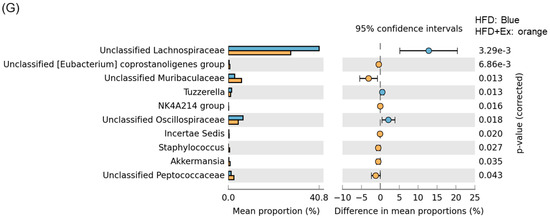 Mucosa-associated microbiota (MAM) analysis: (A) taxonomic analysis; (B–E) comparison of 4 groups (list of bacteria species that showed significant differences among the four groups); (F) bacteria species that showed significant differences between the two groups of ND and ND + Ex; and (G) bacteria species that showed significant differences between the two groups of HFD and HFD + Ex.