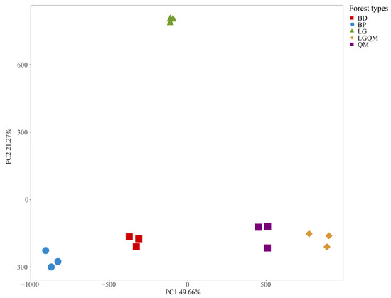 Scores plot of principal component analysis (PCA) showing the values of soil Acidobacteria in different forest types (BD, BP, QM, LGQM, LG). Points of different colors and shapes represent different forest types. The eigenvector is the direction of the axis with the highest variance (most information), called the principal component. Eigenvalues are the variances of a principal component, the relative proportions of which can be interpreted as the variances explained or contribution values. The eigenvalue decreases from the first principal component. The loadings are the eigenvectors multiplied by the square root of the eigenvalues. The loadings are the weight coefficients of the individual raw variables on each principal component. BD: Betula dahurica forest; BP: Betula platyphylla forest; QM: Quercus mongolica forest; LGQM: Q. mongolica and L. gmelinii mixed forest; LG: Larix gmelinii forest.
