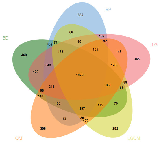 Variance distribution of soil microbial communities under three different treatments (BD, BP, QM, LGQM, LG). Significance levels according to Monte Carlo permutation test (1000 permutations). Different colors represent different treatment conditions. Overlapping areas represent the number of Acidobacterial OTUs common to the different treatment conditions. Non-overlapping areas represent the number of Acidobacterial OTUsgenera specific to the treatment conditions, the number of Acidobacterial OTUst, and the number of genera under different treatment conditions. BD: Betula dahurica forest; BP: Betula platyphylla forest; QM: Quercus mongolica forest; LGQM: Q. mongolica and L. gmelinii mixed forest; LG: Larix gmelinii forest.
