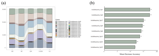 Stacked plot displayed the first 20 Acidobacterial genera in different treatments (a), and the Random Forest classification modeling visually shows the dominant Acidobacterial genera in different treatments (b). Importance of random forest variables derived from a categorical algorithm in predicting rare Acidobacterial genera in soils under different treatments. The green bars represent variables selected using a categorical algorithm. An asterisk near each bar indicates whether each predictor is significant. BD: Betula dahurica forest; BP: Betula platyphylla forest; QM: Quercus mongolica forest; LGQM: Q. mongolica and L. gmelinii mixed forest; LG: Larix gmelinii forest. * represents significance. ** represents highly significance.