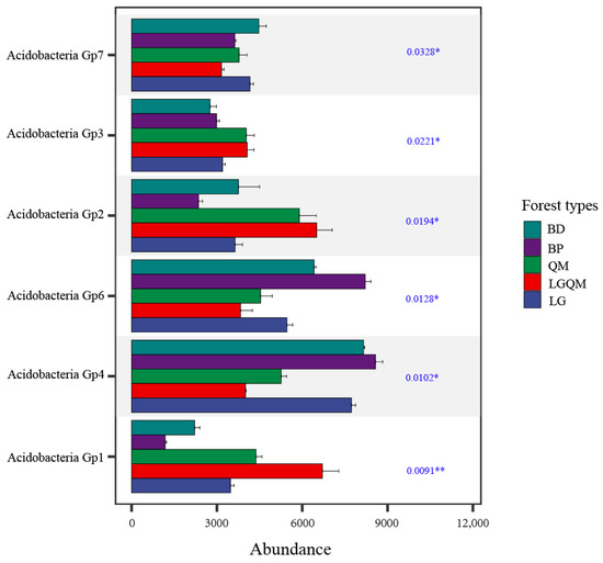 Kruskal–Wallis test showed that different Acidobacterial subgroups had significant differences (p < 0.05) in five forest types (Figure 5). It is worth noting that Acidobacteria_Gp1 had the most significant difference (p < 0.001) among the five forest types compared to the other Acidobacteria genera. In addition, by comparing the abundance of different Acidobacterial subgroups in different forest types, it can be seen that Acidobacteria_Gp1 has the lowest abundance in Betula platyphylla (BP) forest. However, the number of Acidobacteria_Gp6 and Acidobacteria_Gp4 were relatively higher in the Betula platyphylla (BP) forest than in other forest types (Figure 4a and Figure 5). The number of Acidobacteria_Gp2 and Acidobacteria_Gp1 was the highest in the Q. mongolica and L. gmelinii mixed (LGQM) forest (Figure 4a and Figure 5). The number of Acidobacteria_Gp4 was the highest in Larix gmelinii (LG) forest and Betula dahurica (BD) forest (Figure 4a and Figure 5). The number of Acidobacteria_Gp2 was the highest in the Quercus mongolica forest (QM) (Figure 4a and Figure 5).