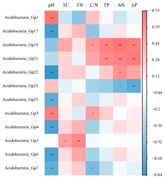The heatmap of Spearman correlation between Acidobacteria genera and soil physical and chemical properties. The legend on the right indicates the degree of correlation. Red indicates positive correlation, while blue indicates negative correlation. * significance at p < 0.05, ** significance at p < 0.01.