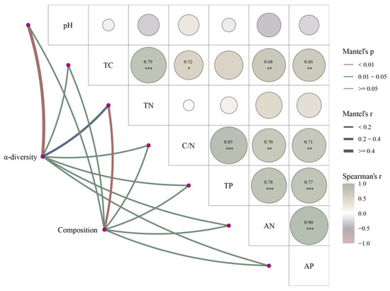 Mantel analysis was used to clarify the relationship between soil Acidobacterial community’s alpha-diversity and composition with soil physicochemical properties. The red and blue lines represent different levels of correlation, and the green line represents no correlation. The thickness of the line (Spearman’s correlation coefficients) represents the magnitude of the correlation. The thicker the line, the greater the correlation. The thinner the line, the smaller the correlation. pH: Pondus hydrogenii; TN: Total Carbon; TN: Total nitrogen; C/N: carbon to nitrogen ratio; TP: Total phosphorus; AN: Available nitrogen; AP: Available phosphorus. Composition was derived based on principal component analysis (PCA). * represents significance. ** denotes highly significance. *** represents extremely significance.