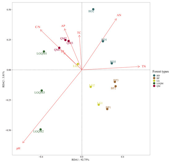 The RDA demonstrated the relationship between soil physicochemical properties and forest types (Figure 8). In addition, the RDA model explained 96.56% of the total variance. Soil pH was positively related to the Q. mongolica and L. gmelinii mixed (LGQM) forest; soil AN and TN were positively related to the Betula dahurica (BD) forest. In addition, soil C/N, TC, TP, and AP were positively correlated with the Quercus mongolica (QM) forest but were negatively correlated with the Betula platyphylla (BP) forest and Larix gmelinii (LG) forest.
