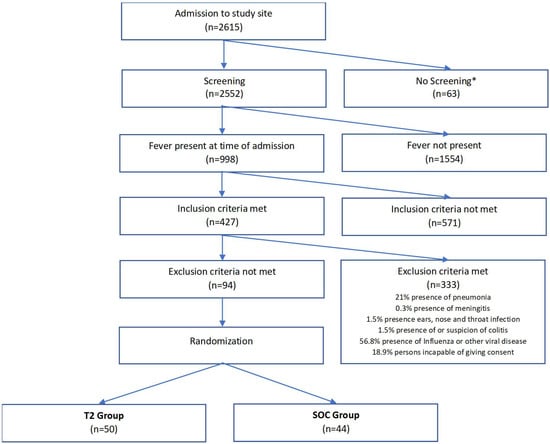 Study participants were split into two groups depending on the day of admission (even vs. uneven day). Patients admitted on the even days of the month were allocated in group “T2 Panel (T2)”, patients admitted on uneven days in group “Standard of Care (SOC)”.