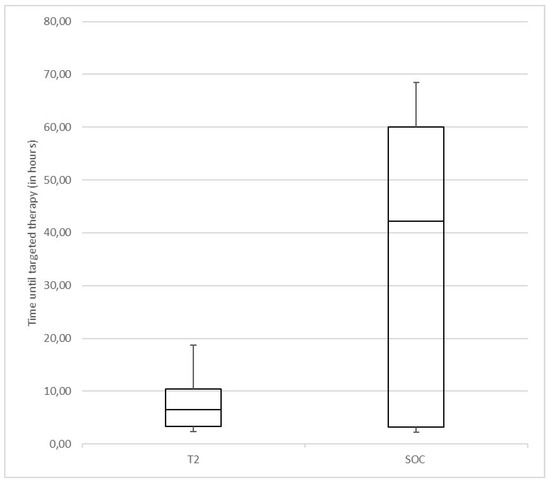 Time until targeted therapy in T2 group (using T2Bacteria®Panel and BC) and SOC group (using BC only).