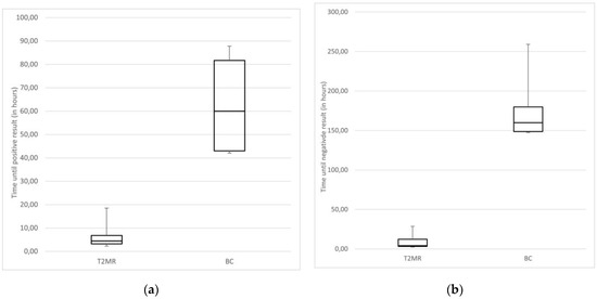 (a) Time until positive result (in hours) using T2Bacteria®Panel and BC; (b) time until negative result (in hours) using T2Bacteria®Panel and BC.