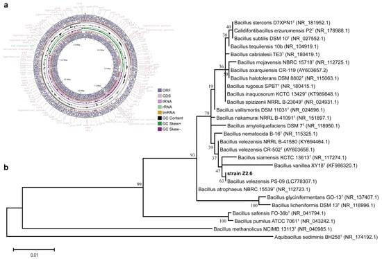 Genome map and phylogenic tree of strain Z2.6. (a) Circular genome map of strain Z2.6. The circular illustration containing five groups of rings was constructed by CGView Sever. Six open reading frame (ORF) rings (in lilac) and two coding sequence (CDS) rings (in light pink) were categorized as two sets in forward and reverse strand directions, respectively located at the outermost and the innermost circular areas. The rings between are aligned as scaffolds, GC content, and GC skew from the outside to the inside. Moreover, the tRNA, rRNA, and tmRNA genes are respectively presented by pink, light green, and orange arrows. (b) Maximum-likelihood phylogenetic tree based on 16S rRNA gene sequences of strain Z2.6 and representative of the other members of close-affinity species in genera bacillus. Bootstrap values (>40) are shown at branch nodes (ML/NJ/MP) based on 1000 replicas. Aquibacillus sediminis BH258 (GenBank accession number NR_174192.1) was chosen as an outgroup. Bar = 1% estimated sequence divergence as substitutions per nucleotide position.