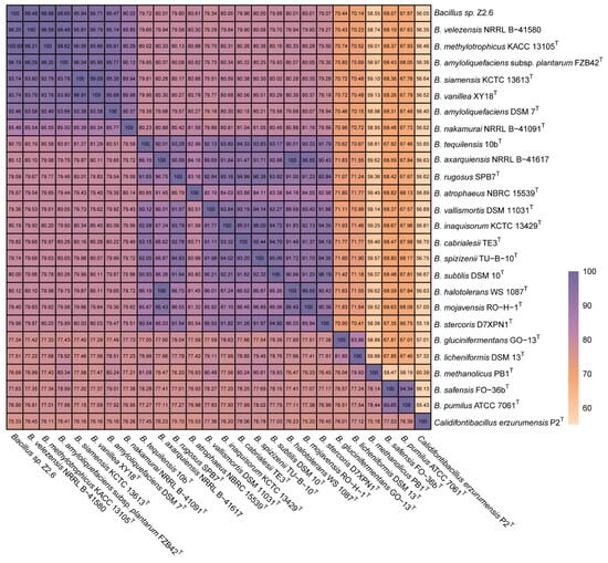 The nucleotide identity (ANI) and the average amino acid identity (AAI) combined heatmap. Pairwise comparisons of ANI and AAI between strain Z2.6 and reference genomes in genus Bacillus and a close strain Calidifontibacillus erzurumensis P2T. Upper triangle, AAI outcomes; lower triangle, ANI outcomes.