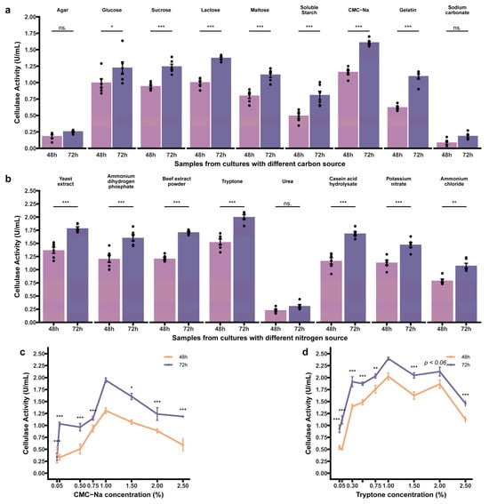 Effect of carbon and nitrogen sources and their concentrations on cellulase production. Effects on (a) carbon source; (b) nitrogen source; (c) CMC-Na concentration; (d) tryptone concentrations. Two-way ANOVA detected p < 0.001 for both effects of carbon and nitrogen sources, and further Tukey post hoc test individually revealed significant difference (p < 0.001, excluding tryptone–yeast extract p < 0.02) to reference groups as CMC-Na (a) and tryptone (b), and each source measured at two time points is annotated with codes. For (c,d), the chosen sources CMC-Na and tryptone illustrated the dynamics of activities with codes representing the comparison between each concentration to the point showing the highest activity. Significance codes are “***”, “**”, and “*”, representing p < 0.001, 0.01, and 0.05, respectively, while “ns.” means nonsignificant (p-values > 0.05). Data are presented as mean ± SEM.