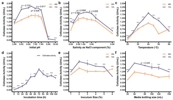 The rest of the one-factor-at-a-time design that induces outstanding crude cellulase activity. The results measured here were produced by FM broth with 1.0% (w/v) CMC-Na as carbon source and 0.3% (w/v) tryptone as nitrogen source. (a) Initial pH; (b) temperature (°C); (c) salinity (%); (d) time (h); (e) inoculum size (%); (f) media bottling volume (mL). All six factors, by two-way ANOVA, provided effects on cellulase production, and the Tukey post hoc test is marked with codes for other measurements against the reference group. Significance codes are “***”, “**”, and “*”, representing p < 0.001, 0.01, and 0.05, respectively, with nonsignificant ones showing specific p-values. Data are presented as mean ± SEM.