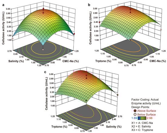 where X1, X2, and X3 represent CMC-Na, salinity, and tryptone, respectively. The determination coefficient, R2, was calculated as 92.16% for this regression, with the adjusted determination coefficient being 82.08%, clarifying the consistencies between practical and predicted cellulase production. This alignment in the two R2 values provided a good estimation of the cellulase production responses within the range of the process conditions [41]. On this basis, the effects of substrates and conditions and their interactions on the responses of the cellulase production were further visualized.