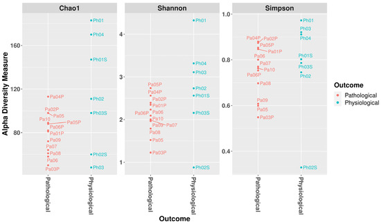 Alpha diversity of the gut wall bacterial communities of pigs. Alpha diversity of the gut bacterial communities of pigs with and without intestinal emphysema lesions (pathological and physiological groups, respectively) according to Chao1, Shannon, and Simpson’s indexes calculated at the genus level.