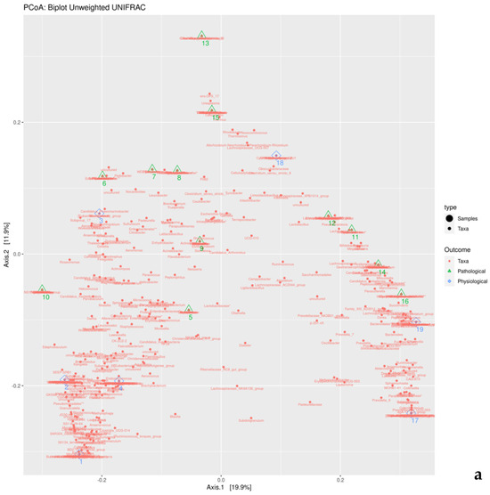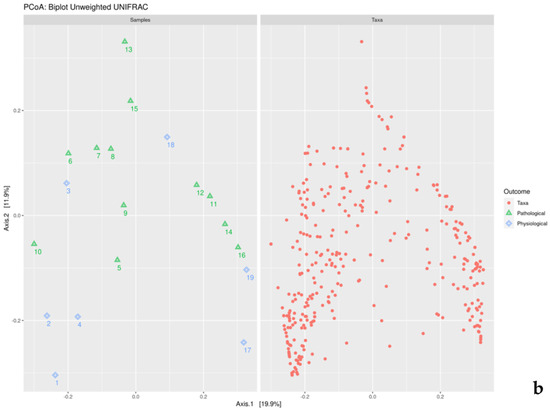 Principal coordinates analysis (PCoA) biplot of the unweighted UniFrac distance matrix generated from taxon abundances showing patterns of beta diversity for gut wall communities of pigs with and without intestinal emphysema lesions (pathological and physiological groups, respectively): (a) superimposed taxa distribution and samples; (b) separated taxa distribution and samples.