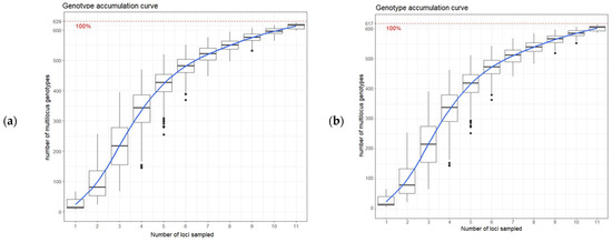 The data were clone-corrected for mating type and metalaxyl resistance using the package poppr [52,53] in R (ver. 4.2.0, R Core Team, Vienna, Austria, 2022 [54]). The R package poppr was also used to plot a genotype accumulation curve and assess the minimum number of loci that can sufficiently differentiate between different genotypes in the P. infestans population [53]. The curve shows a greatly decreased variance over 12 SSR markers and correctly identifies 100% of the multilocus genotypes, indicating its sufficiency for complete genotyping (Figure 1a,b). After correction to remove duplicate genotypes, 629 isolates for mating type and 617 isolates for metalaxyl response remained.