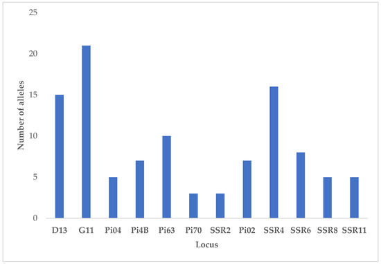 Among the P. infestans isolates characterized with SSR markers, 105 alleles were detected at 12 loci, all of which were polymorphic (Figure 2). They displayed allelic diversity among the isolates, with 3 (SSR2 and Pi70) to 21 alleles (G11) per locus, with an average of 8.75 ± 1.64 alleles.