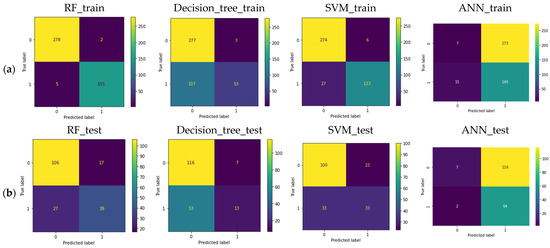 (a) Confusion matrix of training and (b) testing set for mating types (using all marker alleles) for random forest (RF), decision tree classifier, support vector machine (SVM), and artificial neural network (ANN). Coding as follows: 0—A1, 1—A2.