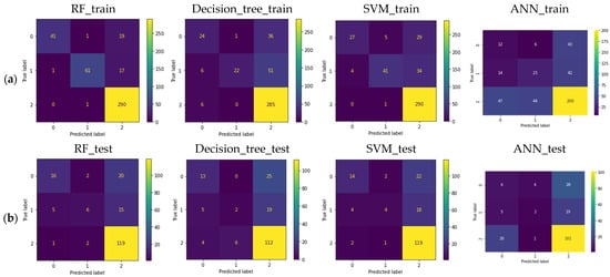 (a) Confusion matrix of training and (b) testing set for metalaxyl response (using all marker alleles) for random forest (RF), decision tree classifier, support vector machine (SVM), and artificial neural network (ANN). NB: Coded; 0: intermediate; 1: resistance; 2: sensitive.