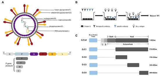 (A) Schematic diagram of the Nipah virus structure. (B) Schematic protocol for the luciferase immunosorbent assay (LISA). A protein G-coated microtiter plate is used to bind the recombinant protein to a specific antibody, and then a luciferase substrate is added to produce a fluorescent signal. (C) Schematic design of the antigen detection fragments. The G protein sequence was fused to the end of the NanoLuc sequence and then cloned into pNLF1-N to construct the recombinant plasmid. CT: cytoplasmic tail region, TM: transmembrane region.