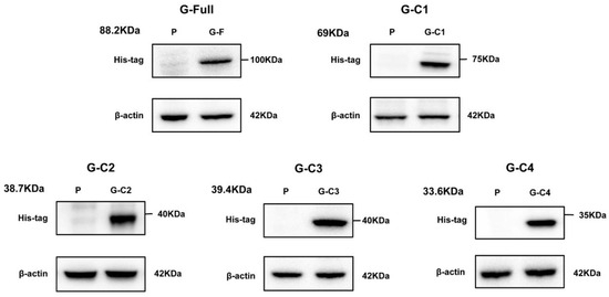 Recombinant plasmids were validated by means of Western blotting. Rabbit anti-His antibodies were used to detect the five fusion proteins, G-Full, G-C1, G-C2, G-C3, and G-C4. Beta-actin was used as an internal control. P, empty plasmid pNLF1-N.