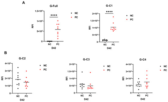 The mean value of the RFI of the negative control was first determined, and the positivity cut-off value was defined as twice the RFI of the negative control. Any sample with an RFI above the positivity cut-off value was considered positive for NiV infection. Then, we performed LISA to detect the NiV IgG antibody based on all five recombinant test fragments. Serum samples obtained 42 days post immunization were analyzed. The full-length fragments, G-Full and G-C1, were able to completely detect nine positive serum samples with 100% detection rates, and the positive detection RFI was significantly higher than the negative control (p < 0.0001, Figure 3A). These results suggested that the efficacy of the G-Full and G-C1 recombinant fragments for the detection of mouse NiV IgG appeared to be optimal.