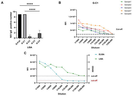 Evaluation of the detection efficacy of the G-C1 fragment. (A) Comparison of the numbers of detected fragments from the five tested fragments of the NiV G antigen. ****, p < 0.0001, one-way ANOVA test. (B) Sensitivity analysis of G-C1. Five positive sera were randomly selected and diluted to different folds, with the positivity cut-off value of twice the mean value of the negative control. (C) A sensitivity analysis was conducted comparing the LISA with an indirect ELISA. Measurements were carried out using a gradient dilution of serum, and the positivity cut-off value for positive results is indicated by the dashed line.