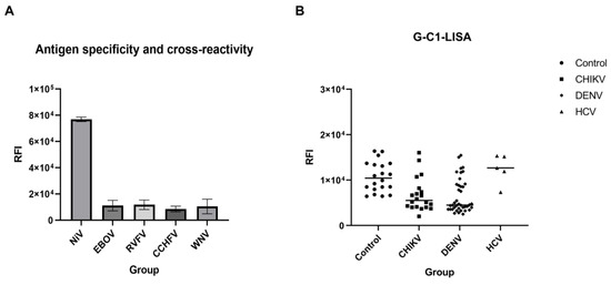 Cross-reactivity of the G-C1-LISA. (A) Validation was performed using positive horse sera from NiV, Ebola virus (EBOV), Rift Valley fever virus (RVFV), Crimean–Congo hemorrhagic fever (CCHFV), and West Nile Virus (WVN) infections. (B) Serum samples from healthy humans were used as the controls, and the G-C1-LISA was evaluated for cross-reactivity using positive sera from patients infected with CHIKV, DENV, and HCV.