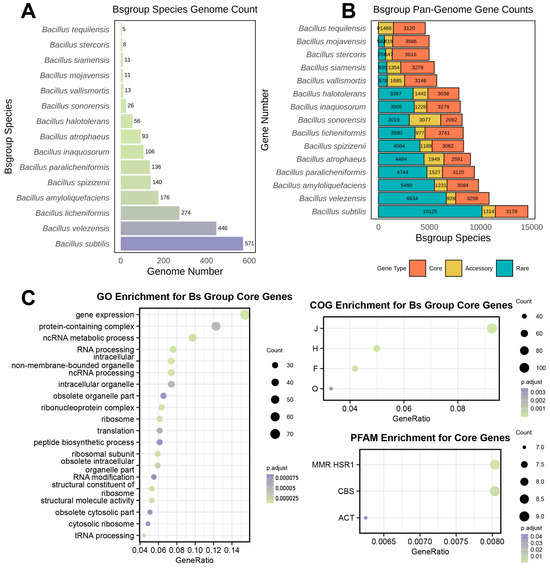 Genome quantity, non-redundant gene set size and core gene functional enrichment results in the Bs Group. (A) Number of genomes used for constructing the pangenome of Bs group members; (B) size of the non-redundant gene set for the pangenomes corresponding to Bs group members, with orange representing core genes, yellow for accessory genes, and blue for rare genes. (C) All terms have p-values that pass the hypergeometric distribution test and remain significant after Benjamini and Hochberg correction, indicated as p.adjust in the figure; the x-axis represents the proportion of the corresponding pathway gene quantity, and the bubble size indicates the number of related genes.