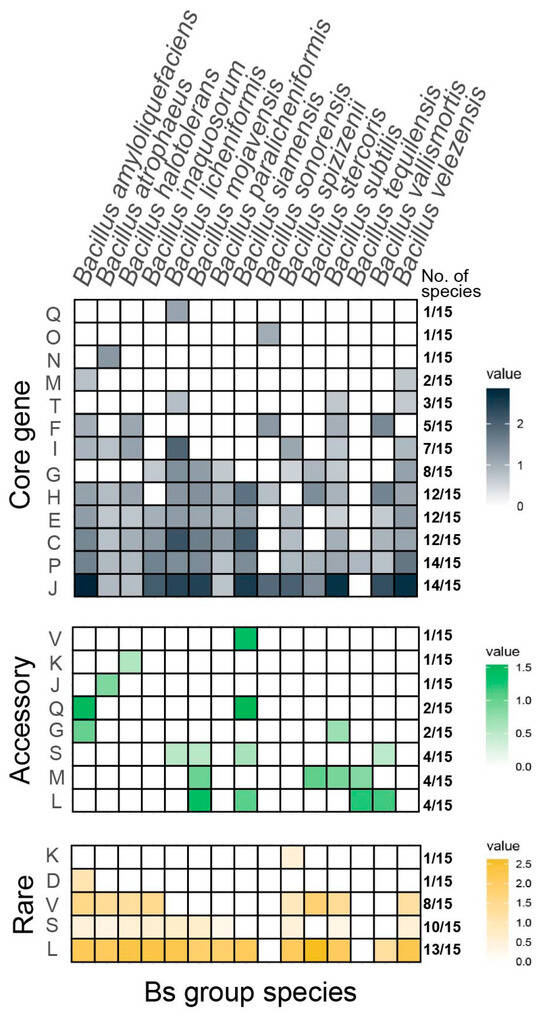 COG enrichment analysis of individuals was conducted for the Bs group members, with the results for the three types of genes across the 15 species (Figure 2).