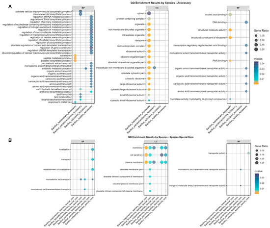 GO enrichment results for Bs Group species-specific core gene and accessory gene set. (A) GO enrichment results for accessory gene sets specific to members of the Bs group, from left to right, are for the GO enrichments in biological process (BP), cellular component (CC), and molecular function (MF) categories, with four species within the Bs group showing significant GO enrichment results. (B) Enrichment results for species-specific core gene sets, from left to right, are for the GO enrichments in biological process (BP), cellular component (CC), and molecular function (MF) categories, with six species showing significant GO enrichment results. The q-value is based on the hypergeometric test and adjusted using the Benjamini and Hochberg method, with only significant results displayed in the figure. The orange sections indicate a q-value of less than 0.01. The descriptive terms for GO enrichment are converted using the enricher function, as detailed in Section 2.4.
