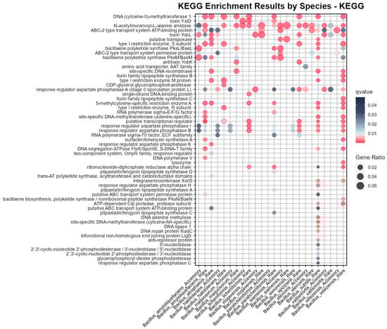 The x-axis represents the gene sets corresponding to species with significant KEGG enrichment results, with 14 species in total and only B. tequilensis lacking enrichment results. The y-axis represents functional description terms, the bubble size indicates the proportion of the pathway result, and the q-value is based on the hypergeometric distribution test and adjusted using the Benjamini and Hochberg method, with significant results displayed in pink, indicating a q-value of less than 0.01. All bubbles appearing in Figure 4 meet the corrected significance threshold requirements. Note that there are two bubbles associated with the description ‘putative transcriptional regulator’ in the context of the ‘B. halotolerans rare genes’. This is not an error, as it involves simultaneous enrichment in pathways: ko:K07727 and ko:K07729.