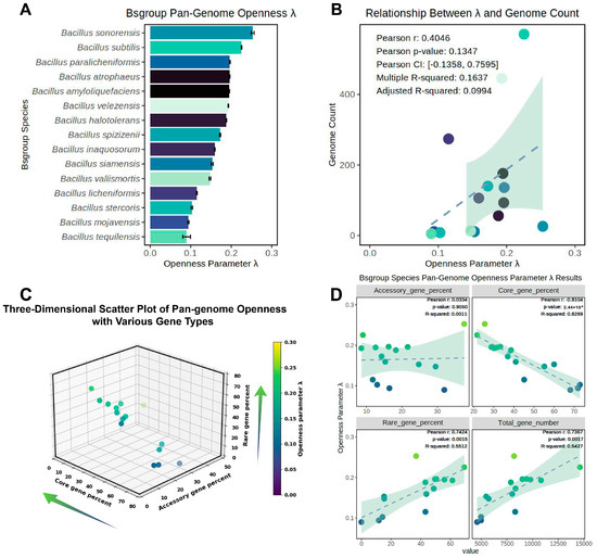 Exploration of the relationship between pangenome openness and genome quantity in the Bs group. (A) The magnitude and variance of the pangenome openness index λ for the Bs group; (B) study of the correlation between λ and the number of genomes used in pangenome construction. Pearson’s correlation coefficient and linear model were used to explore the relationship between variables, with related parameters annotated in the upper left corner of Figure 5B. (C) Scatter distribution of the percentage of core, accessory, and rare genes with the pangenome openness index λ; (D) the linear correlation between the percentage of core, accessory, and rare genes, the quantity of the complete non-redundant gene set for individual species, and λ, with Pearson’s correlation coefficient, p-value, and R-squared of the linear model annotated in the upper right corner. The colors in Figure 5A,B were matched, with different colors used to distinguish different species; Figure 5C,D shared matching colors, with the color scheme in Figure 5D following the same pattern as in Figure 5C, where lighter colors represented greater species openness index; the direction of arrows in Figure 5C indicated the direction of increasing openness along the corresponding axes.