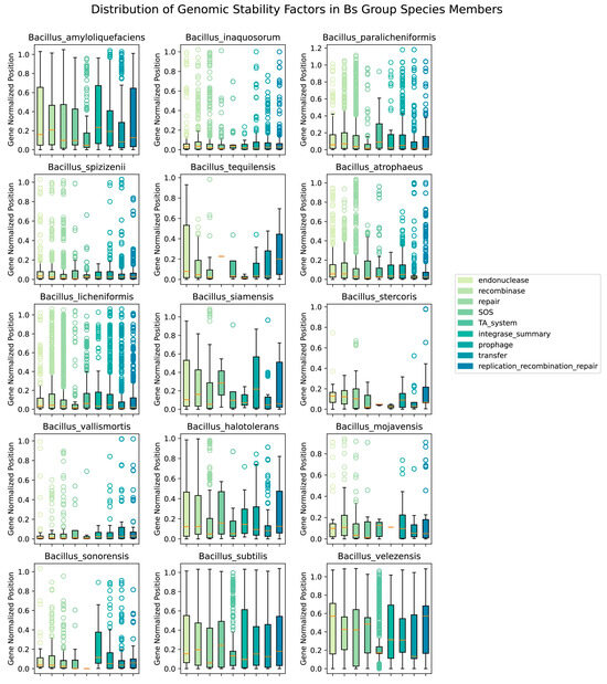 The figure includes 15 Bs group species members, each corresponding to the boxplot of nine categories of genes influencing genome stability on the right. The y-axis represents the relative distribution of the initiation sites of the related genes compared to the average genome size of the species, which is typically in the range of 0–1; however, some points exceed 1, as a few sample points have absolute initiation sites on the genome that are larger than the average genome size of the species. The orange lines in Figure 6 represented the mean values of the distribution data for corresponding factors.