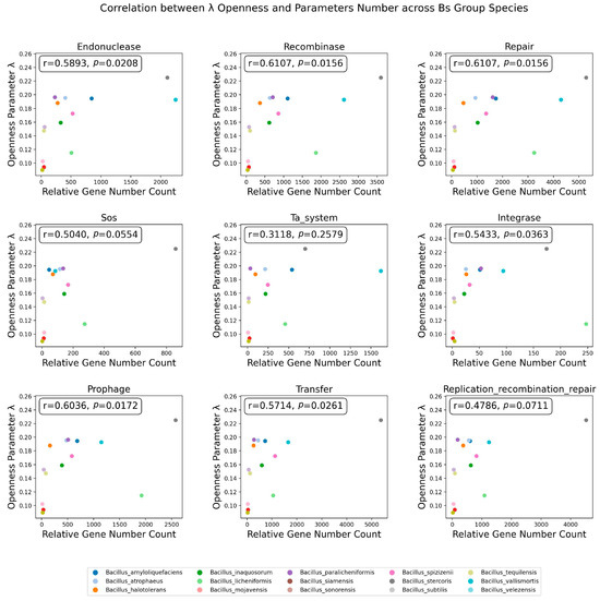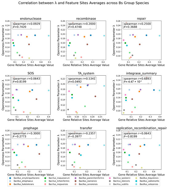The percentage of core and rare genes were key indicators affecting the openness parameter λ of the species, but this was insufficient to clearly articulate the biological drivers behind the differences in openness between species. This study posited that the differences in pangenome openness were fundamentally related to genome stability, and many factors influencing bacterial genome stability have been systematically reported [43]. Building on this, the current study selected nine systems for exploration, including genes related to endonucleases, recombinases, repair systems, SOS systems, toxin–antitoxin systems, prophages, integrases, transfer mobile elements predicted by the mobileOG database, and replication/recombination/repair mobile elements, to investigate the driving forces behind the openness parameter λ of the Bs group members’ pangenomes.