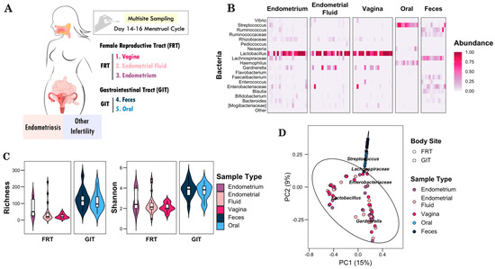 Female gastrointestinal and reproductive microbial profile. (A) Diagram that includes the body sites of the female reproductive tract (FRT) and the gastrointestinal tract (GIT). The types of samples collected for the study in the GIT were oral and feces and in the FRT were endometrium, endometrial fluid, and vagina. (B) Relative abundance of the main taxa in the sample types included in the study. Each column corresponds to an individual sample, and the color shows relative abundance. (C) Violin plot showing richness and Shannon indices as alpha diversity. The panels were separated by body sites. The sample types are shown as variables within each body site. (D) Principal coordinate analysis using Bray–Curtis distances for the distribution of the microbial community between body sites. Each point corresponds to a sample. The shapes show the body sites and colors for the sample types included in the study. Ellipses represent aggregation by body sites.