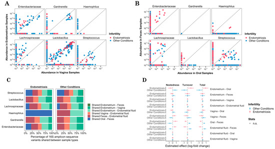 After analyzing the female microbiome, we showed that an increase in Enterobacteriaceae and Lachnospiraceae appeared to be associated with a decrease in Lactobacillus in the endometrial microbiome (Figure 1B). Therefore, the bacterial ASVs found within the FRT and GIT sites related to the infertility groups raise the question of whether the body sites shared the microbiome. We analyzed the shared ASVs between body sites and sample types (Figure 2C). We observed higher levels of shared Enterobacteriaceae (25%) and Gardnerella (24.61%) in endometrial and vaginal samples for women with other conditions compared to those with endometriosis (13.95% and 13.33%, respectively). In contrast, higher levels of shared Enterobacteriaceae (20.93%) were found in oral–fecal samples of women with endometriosis compared to other conditions of infertility (0.96%). Gardnerella appeared in both the FRT and FRT–GIT comparisons but was absent in the GIT-only samples in both study groups. In oral and fecal samples, the relative abundance of Streptococcus ASV was elevated in both study groups, 25.64% for women with endometriosis and 27.15% for those with other conditions. It also should be noted that Haemophilus was identified as a specific taxon associated with the GIT in cases of endometriosis. The diversity of ASVs within Haemophilus was limited to two distinct ASVs (Figure 2B). In other infertility conditions, Haemophilus was present in endometrium–endometrial fluid and feces–endometrial fluid comparisons. This finding could explain the ability of Haemophilus to adapt to the endometriosis environment, compared to other conditions of infertility.