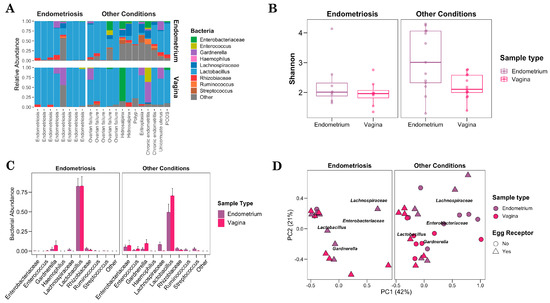 Female reproductive tract microbiome associated with infertility. (A) Main relative abundance of bacteria showing the variability between patients (in columns) separated by endometriosis and other infertility conditions (vertical panels) and sample types such as endometrium and vagina (horizontal panels). (B) Boxplot showing the diversity index for sample types (endometrium and vagina) and infertility groups such as endometriosis and other infertility conditions. (C) Mean of bacterial abundance and its standard deviation related to endometriosis and other infertility conditions. (D) Principal coordinate analysis that evaluates the distribution of the microbial community using weighted Unifrac distances. The colors correspond to the type and shape of the sample to women as an egg receptor.
