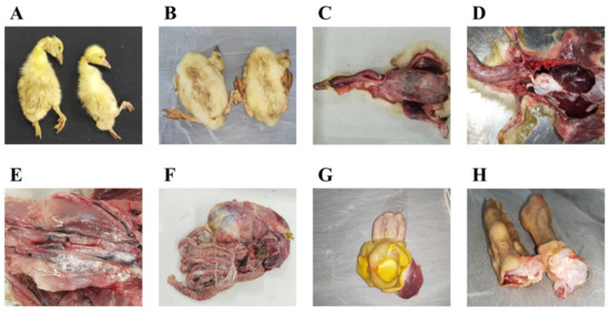 Clinical symptoms of suspected GAstV infection in geese. (A) Seven-day-old goslings suspected of having gout; (B) 15-day-old goslings suspected of having gout; (C) Urate deposited in the subcutaneous, tracheal serosa, pectoralis muscle, and leg muscle of geese; (D) Urate deposited in the heart, lung, and leg muscle of geese; (E) Urate deposited in the kidneys of geese; (F) Urate deposited in the splenic, glandular gastric, peritoneal gastric, and intestinal serosa of geese; (G) Ulcers with urate deposits were observed on the gastric mucosa of the gizzard; (H) Urate deposits were also found in the lumen of the tarsal joint.