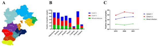 Detection results of GAstV for 474 samples. (A) Map of Hebei Province; (B) The number of positive samples of GAstV in different regions of Hebei Province; (C) Positivity of GAstV-positive samples in the different years.