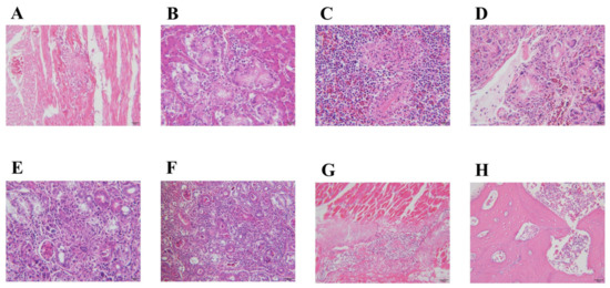 HE staining results. (A) Urate crystals were observed in myocardial fibers surrounded by monocytes; (B) Urate crystals were observed in the liver surrounded by epithelioid cells; (C) Urinate crystals were observed in the spleen surrounded by epithelioid cells and lymphocytes; (D) Urate crystals were observed in the lung surrounded by monocytes, epithelioid cells, and multinucleated giant cells; (E) Urate crystals were observed in the kidney surrounded by epithelioid cells; (F) Lymphocytes infiltrated in the renal interstitium were observed; (G) Coagulation necrosis of the leg muscles, precipitation of urate crystals, and infiltration of lymphocytes and monocytes were observed; (H) Urate crystals and infiltrated inflammatory cells were observed in the tarsal joint cavity. The scale bars are 50 μm in (G) and 20 μm in all other figures.