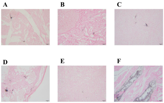 Results of urate staining. (A) myocardium; (B) liver; (C) spleen; (D) lung; (E) kidney; (F) leg muscle. The scale bar represents 50 μm.