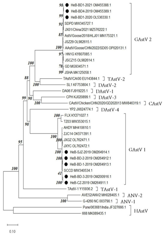 - Xu, J.; Gao, L.; Zhu, P.; Chen, S.; Chen, Z.; Yan, Z.; Lin, W.; Yin, L.; Javed, M.T.; Tang, Z.; et al. Isolation, identification, and pathogenicity analysis of newly emerging gosling astrovirus in South China. Front. Microbiol. 2023, 14, 1112245. [Google Scholar] [CrossRef] [PubMed]