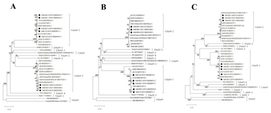 Phylogenetic trees of the GAstV gene based on its encoded amino acid sequences. (A) ORF1a; (B) ORF1b; (C) ORF2.