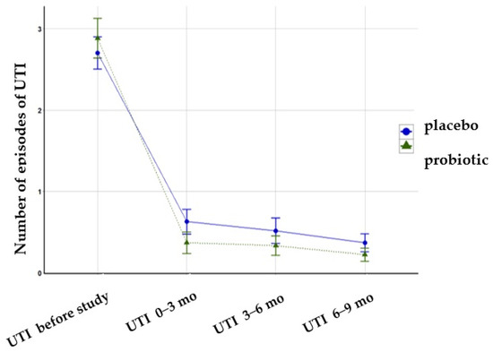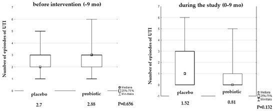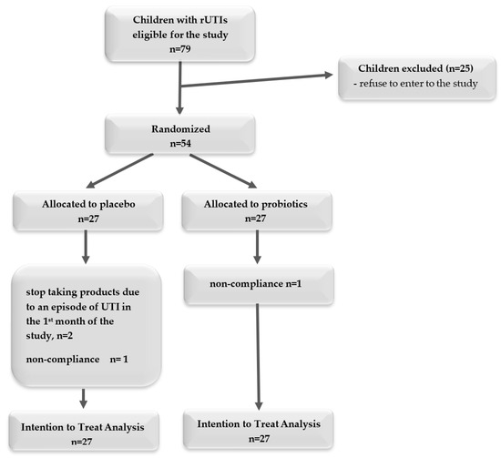 - Sadeghi-Bojd, S.; Naghshizadian, R.; Mazaheri, M.; Ghane Sharbaf, F.; Assadi, F. Efficacy of Probiotic Prophylaxis After The First Febrile Urinary Tract Infection in Children With Normal Urinary Tracts. J. Pediatr. Infect. Dis. Soc. 2020, 9, 305–310. [Google Scholar] [CrossRef] [PubMed]