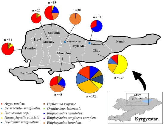A map of tick species’ composition in the different sampling regions of Chuy Province, Kyrgyzstan, in 2022. The different colors indicate different tick species. The sizes of the circles represent the number of collected ticks and the pie charts illustrate their relative proportions in each collection region.
