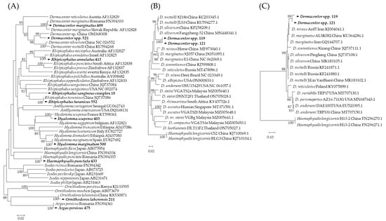 For tick species’ identification, CO1 should be considered first; if CO1 does not provide reliable results, 16S rRNA, ITS2, or 12S rRNA can be used [19]. Our study found that the sequences of Dermacentor spp. formed a clade distinct from other validated Dermacentor species in the phylogenetic analysis using CO1. Additional phylogenetic analysis was conducted using 16S rRNA and ITS2 for cases in which CO1 was not analyzable.