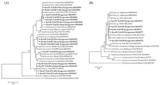 A total of 12 representative sequences for Anaplasma and 4 representative sequences for Ehrlichia were selected without duplicate sequences among those identified as positive for 71 Anaplasma and 5 Ehrlichia species, respectively (Table 2). Each pathogen was detected in two to three tick species. A. bovis sequences obtained from H. punctata and R. annulatus (OR234598) showed a 100% identity with A. bovis isolated from goats in China (MH255939). A. bovis sequences obtained from R. turanicus (OR234603) were similar to A. bovis isolated from rats in Taiwan (OK560164), and A. bovis sequences obtained from Demacentor spp. and H. punctata (OR234597 and OR23460-OR234602) revealed a 99.30–99.88% similarity with A. bovis isolated from H. longicornis in ROK (EU181143). A. ovis sequences obtained from Hy. marginatum, R. turanicus, and Dermacentor spp. (OR150327) exhibited a 100% identity with A. ovis detected in goats and sheep in China (MG869525 and KX579073, respectively.) A. capra sequences obtained from H. punctata (OR150332) shared 100% and 99.88% identities with A. capra isolated from cattle in Kyrgyzstan (MW672115) and sheep in China (MF066918), respectively. Anaplasma spp. sequences obtained from A. persicus and H. scupense (OR150334, OR150337, OR150343, OR150349) shared a 99.19–99.54% identity with that of Anaplasma spp. isolated from the soft tick, A. walkerae, in Zambia (LC558323). Phylogenetic analysis based on partial 16S rRNA sequences revealed that A. bovis, A. capra, A. ovis, and Anaplasma spp. detected in this study were included in the Anaplasma species (Figure 3A).