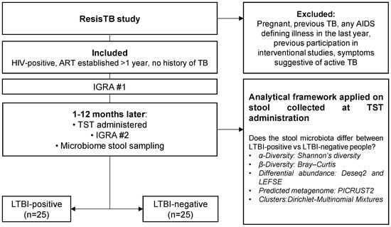 Study flow diagram. We collected and analysed stool from 25 LTBI-positive and 25 LTBI-negative people enrolled in a parent study (ResisTB). Abbreviations: ART: antiretroviral therapy; HIV: human immunodeficiency virus; IGRA: interferon-gamma release assay; TST: tuberculin skin test; LTBI: latent TB infection; TB: tuberculosis.